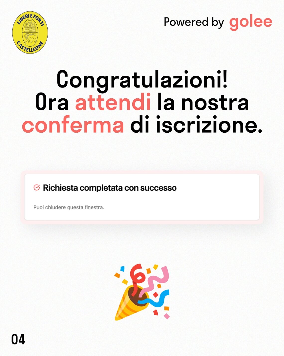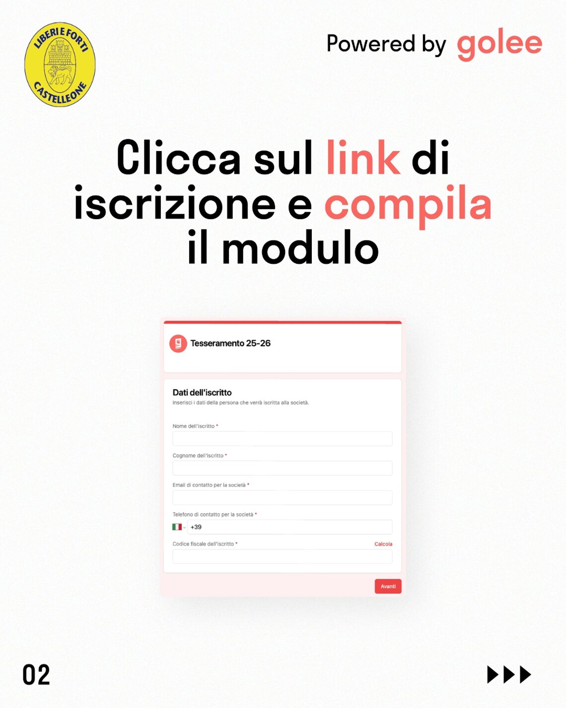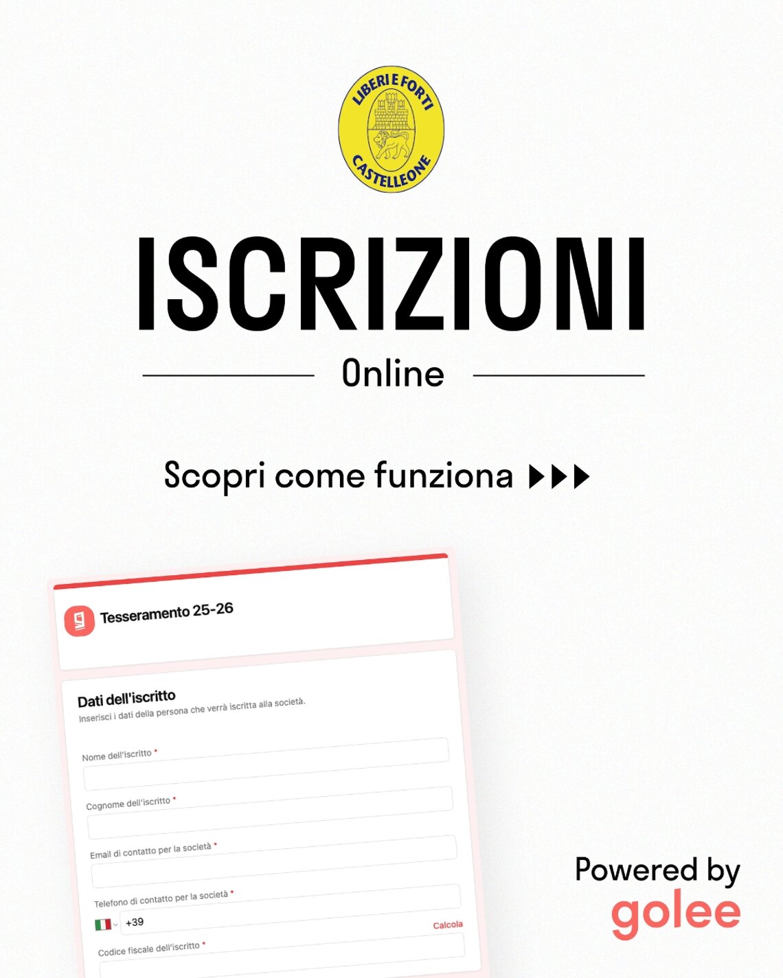 Clicca sul pulsante corrispondente alla categoria di interesse, verrai indirizzato al modulo Golee dedicato: ti basterà compilare i campi richiesti per completare l’iscrizione con facilità (senza più dover compilare il modulo cartaceo).
